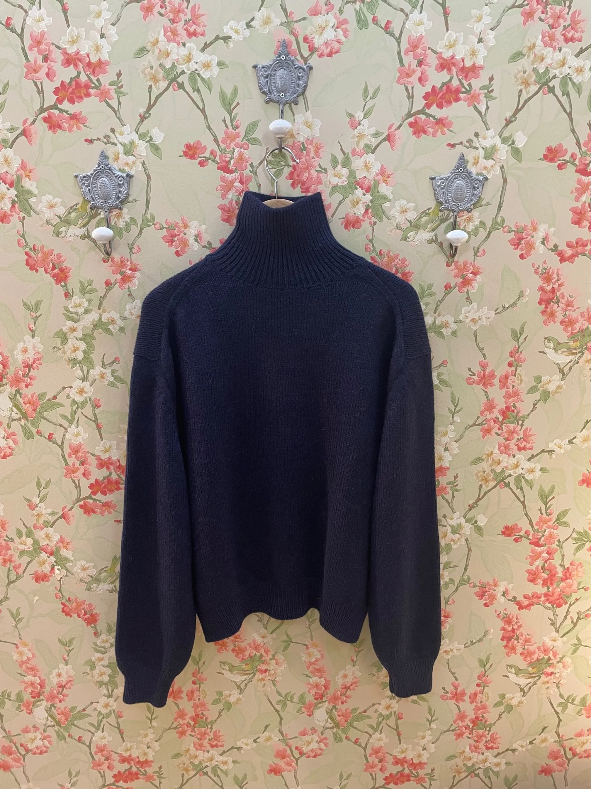 Pull en laine coupe ample, col roulé, manches longues et poignets resserrés, emmanchure large.