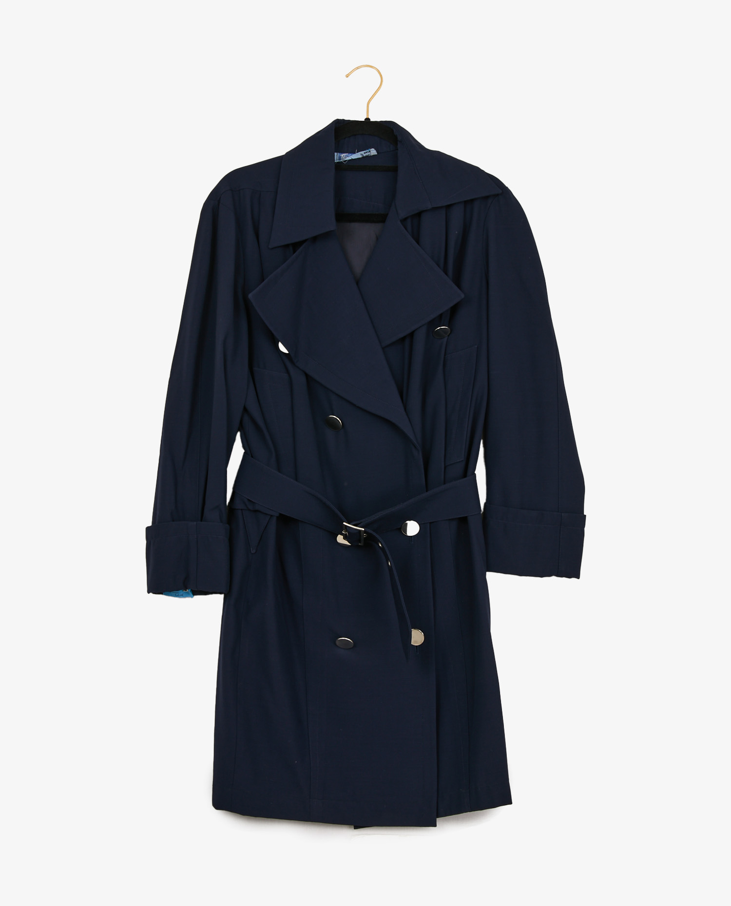 Pantalon de tailleur bleu marine à coupe droite, doté d'un devant net et de pattes latérales réglables à la taille pour un ajustement personnalisé.