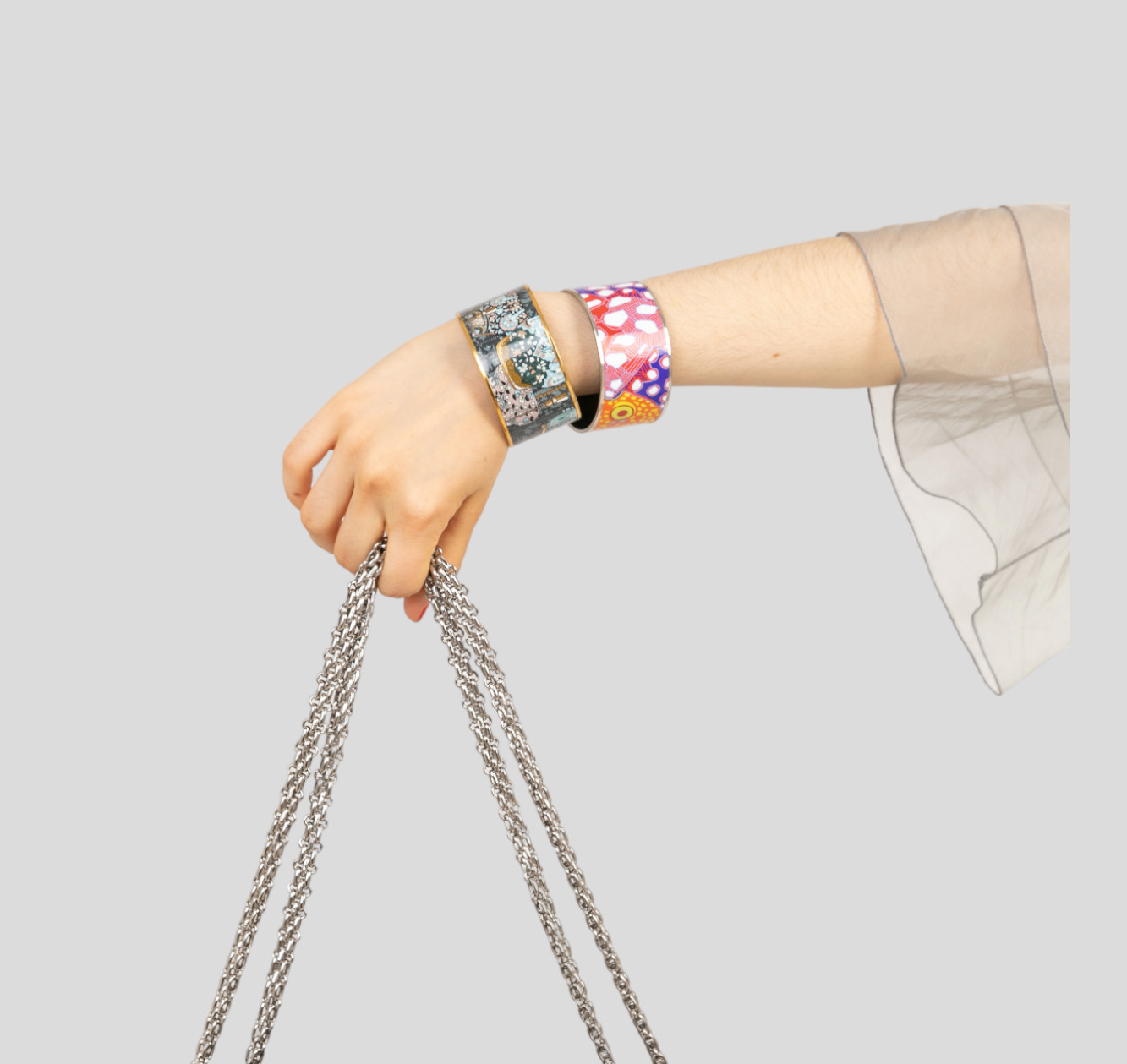 Hermès large bangle with red, blue, yellow and orange abstract patterns. Finishes are in silver metal.