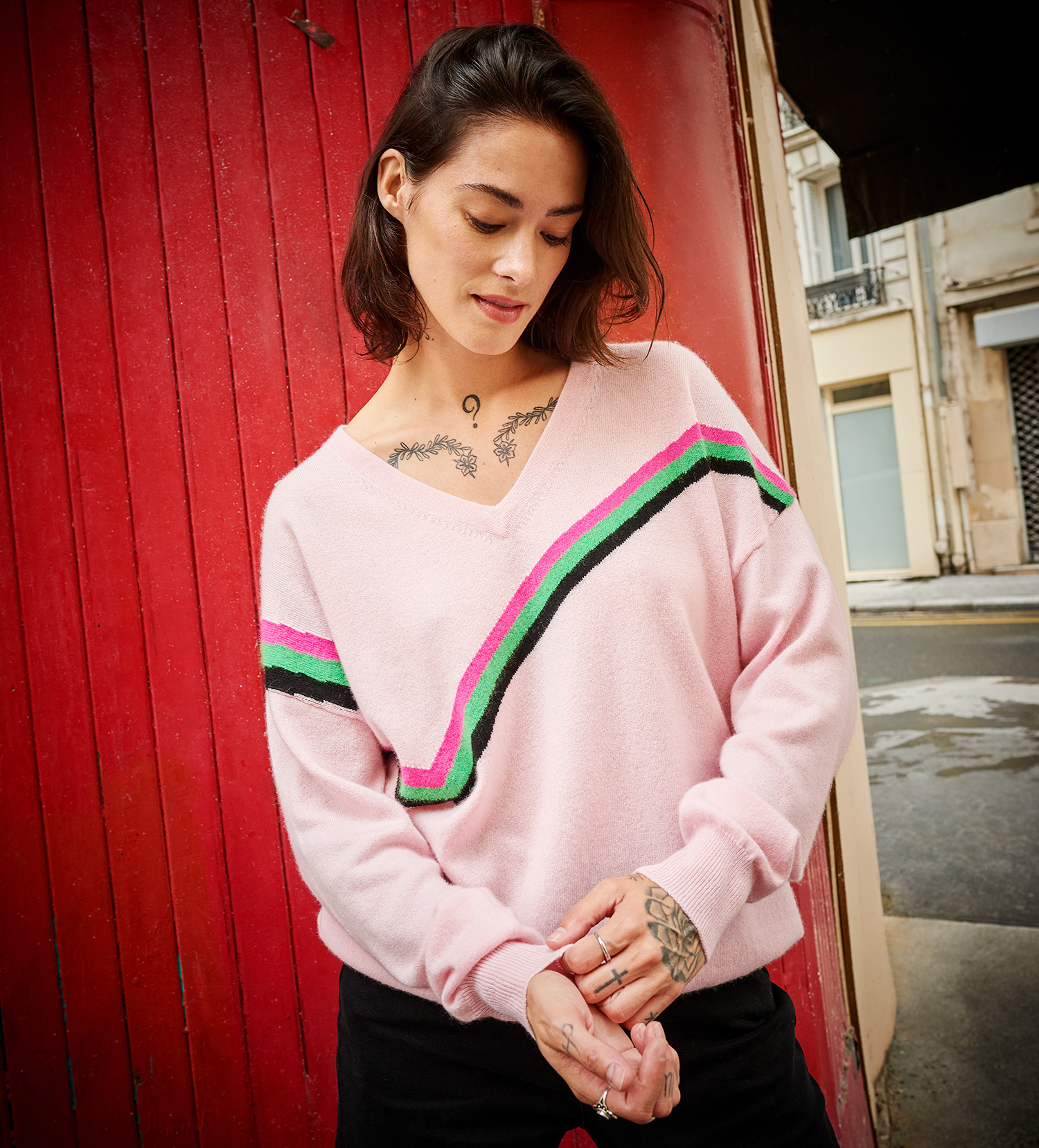 Ce pull en cachemire arbore des bandes tricolores sur les côtés, de quoi apporter une touche d'audace à l'allure structurée. Muni d'un col montant, de manches longues et de bords côtelés, il s'associe à un jean ample ou une jupe fluide.