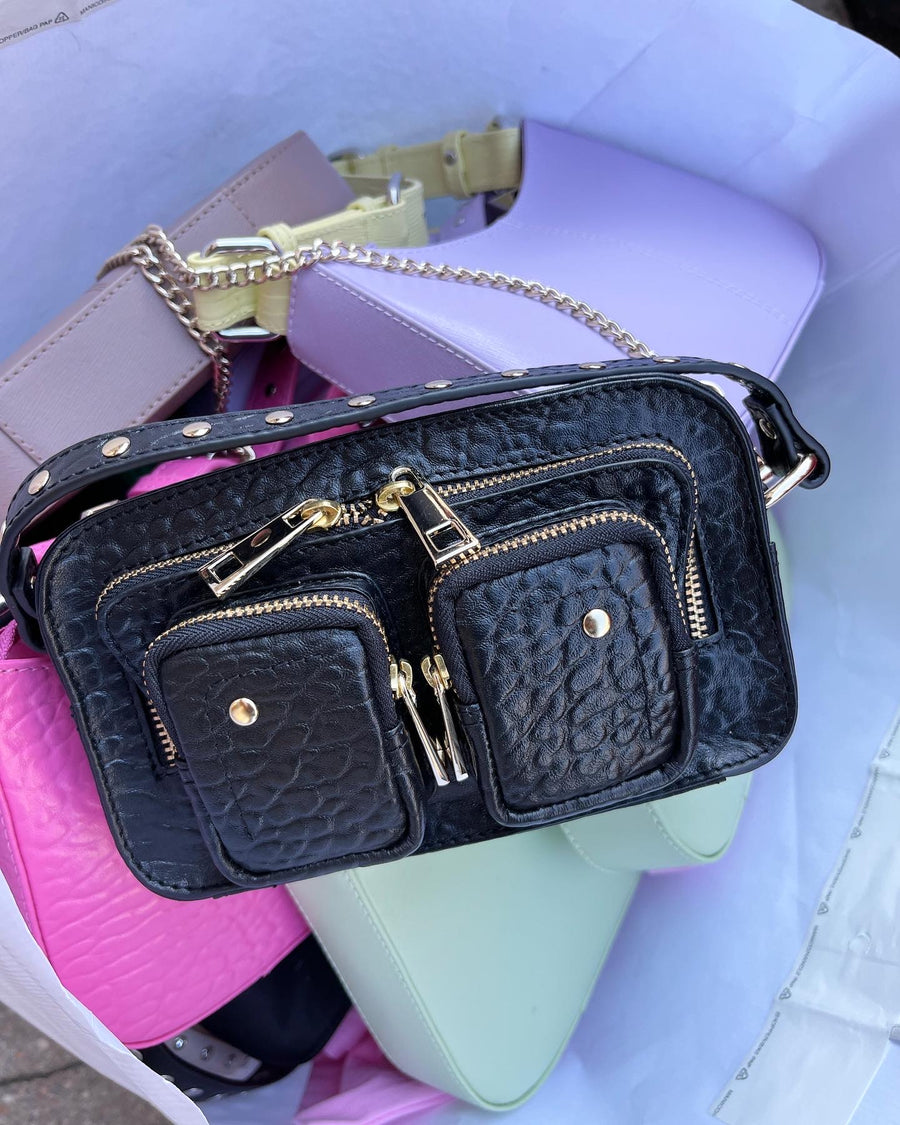 Le sac est fait de notre cuir néo-zélandais et a des détails dorés. Le compartiment principal et les trois compartiments à l'avant du sac se ferment tous par un zip. Le sac est livré avec une bandoulière en cuir réglable et une chaîne.