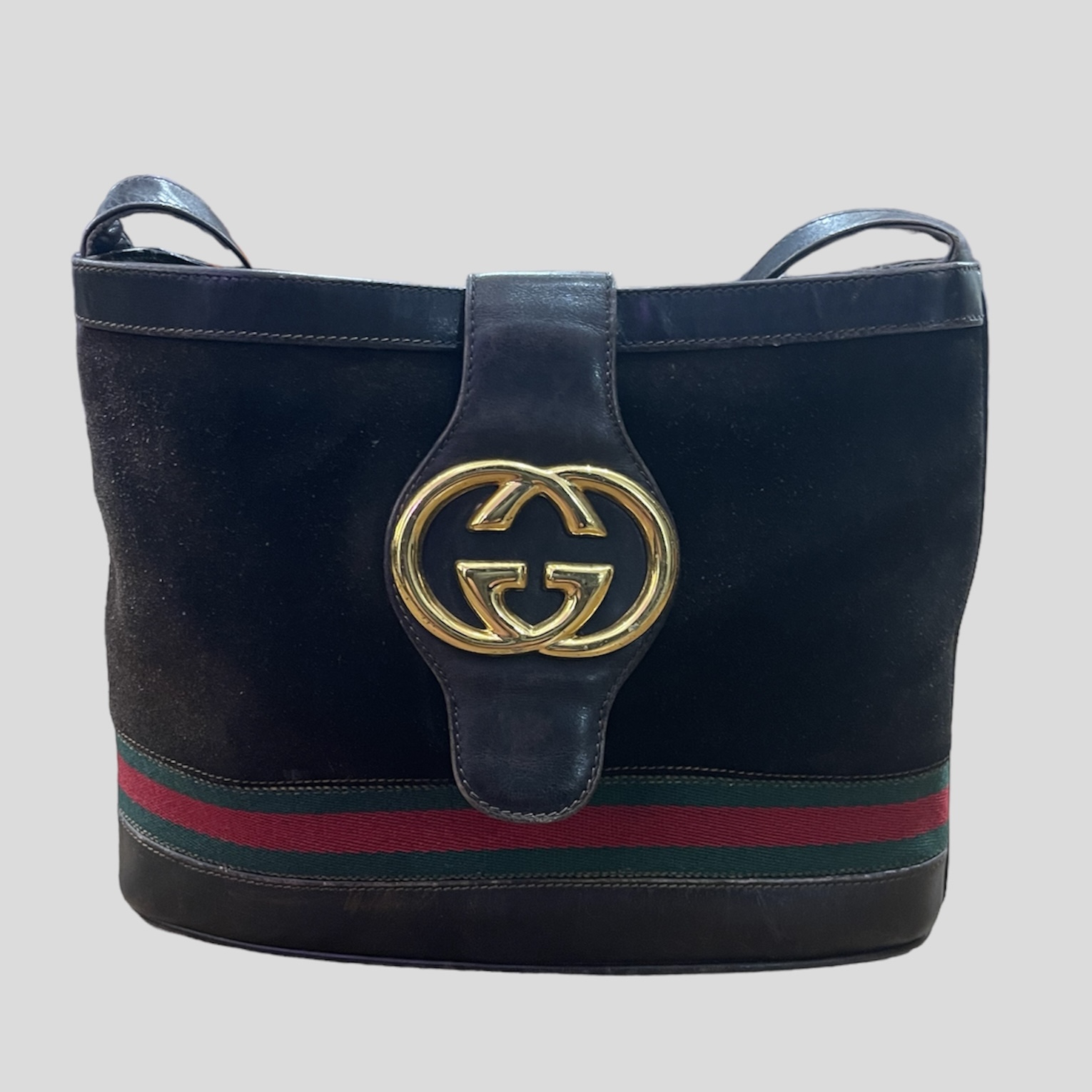 Gucci suede bag with red and green lines with old gold logo, from the 80's. Adjustable handle. One pocket inside.
