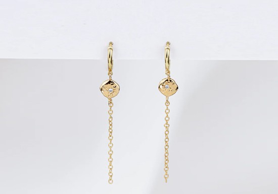 Boucles d'oreilles Yara, collection Elements.Boucles composées d'une petite créole dorée et d'un pendentif orné d'une chaîne et d'une pierre de zircon blanc.Matière : laiton doré 24k.Dorure garantie 1 an.Diamètre créole : 1 cm.Shlomit Ofir est une créatrice Israélienne à l'univers féminin et poétique.  Ses bijoux aux lignes graphiques, ont une inspiration très romantique et intemporelle.