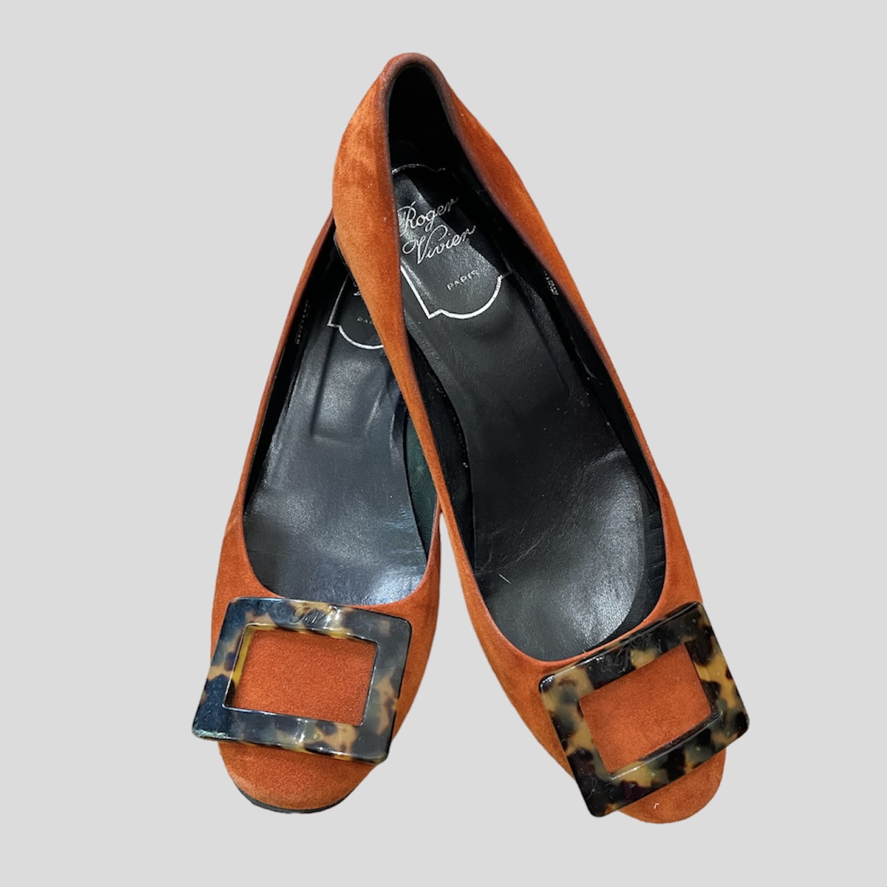 Roger Vivier orange suede ballerinas with 3.5 cm heels. The shoe features a rectangular scaled detail at the front.