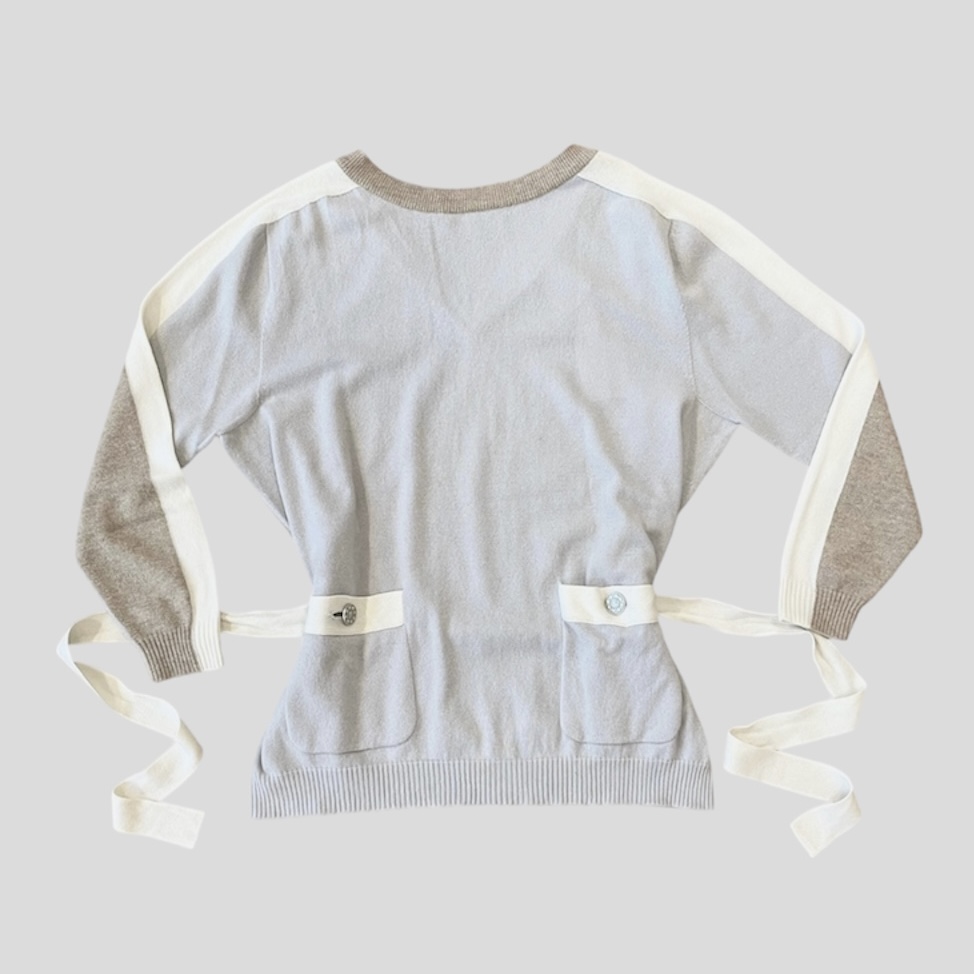 Chanel tricolored halter pullover in cashmere with neckline in the back. It has a white strap to tie in front and also two pockets with buttons logoed "CC". The pullover is blue in the front and brown in the back, with white stripes on the sleeves.