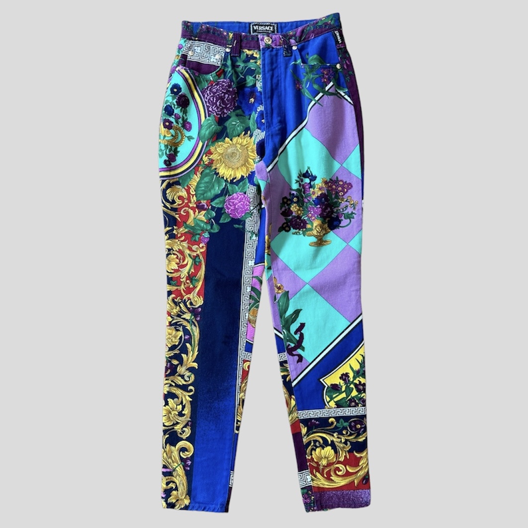Gianni Versace vintage couture pants with colorful designs from the 80's, with two pockets at the front and back.