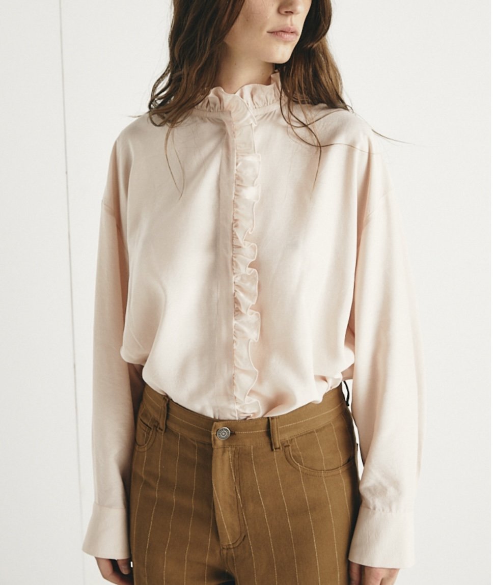Blouse boutonnée en viscose et soie, coupe ample et droite, manches longues, poignets resserrés, volants sur la patte de boutonnage et le col. Le modèle taille très grand et se porte grand.