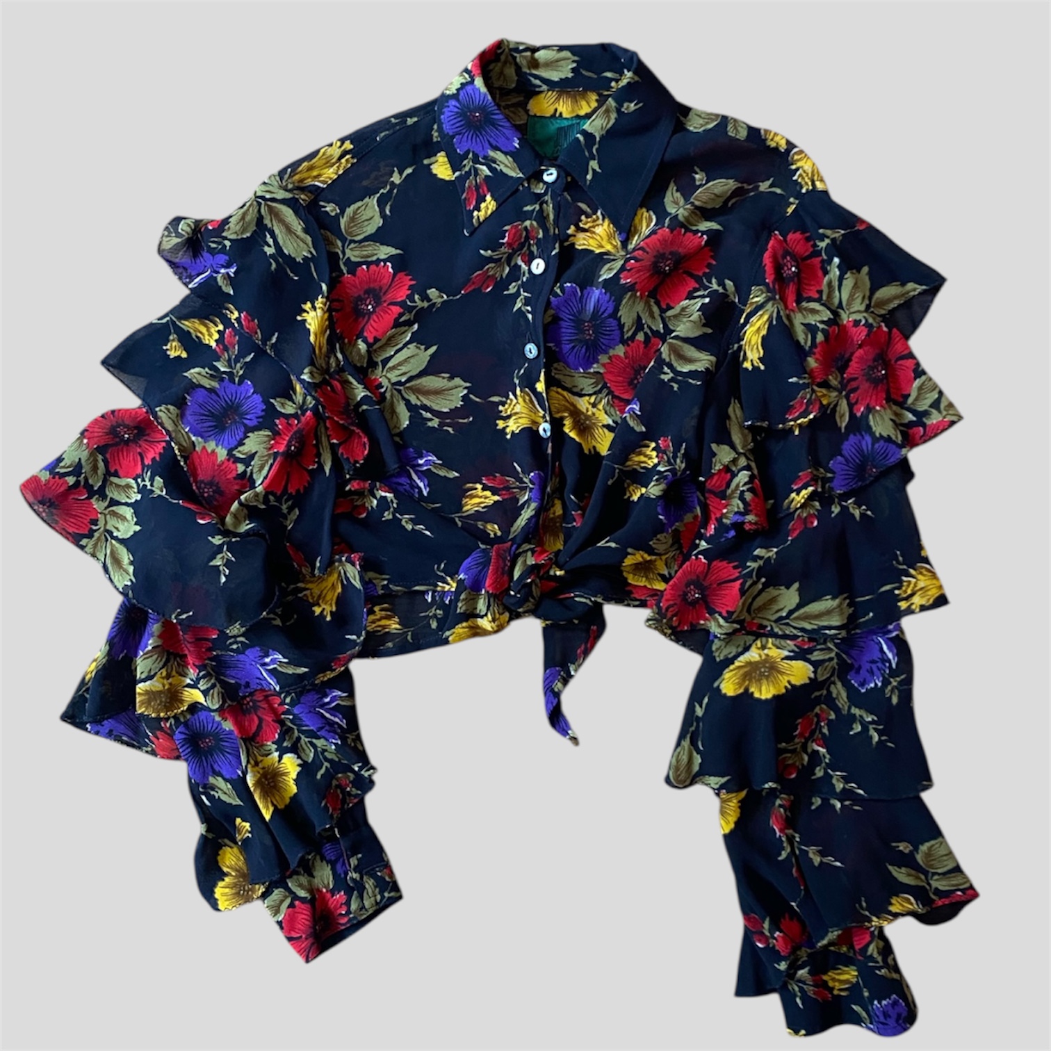 Jean Paul Gaultier Blouse with ruffled sleeves. The shirt is crop, with a little bow on the front. It has flower patterns. From 1989.