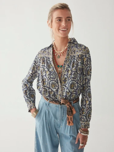 Coupé dans un tissu en coton lurex unique, le chemisier boutonné présente un imprimé floral vintage avec un lavage à la main appliqué (chaque pièce est unique et présente des variations mineures), ce qui rend cette pièce suintant le vintage. Fini avec des bordures contrastées et de fins détails en dentelle.