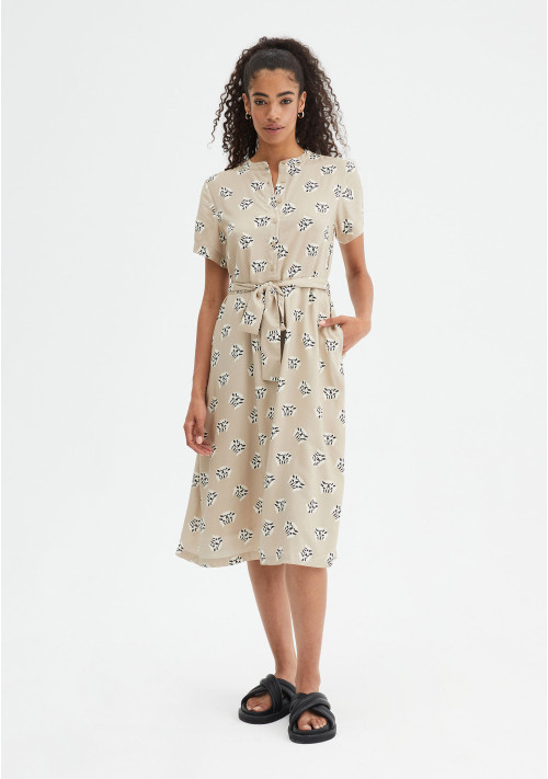 Robe midi évasée en viscose imprimé chat Lenzing Ecovero. Col Mao et manches courtes. Boutons et ceinture devant. Le mannequin mesure 178 cm et porte une taille S.