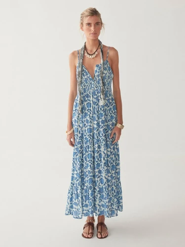 Coupée dans un modal viscose incroyablement doux, la robe à fleurs indigo présente une poitrine smockée et demi-boutonnée, permettant de multiples combinaisons.