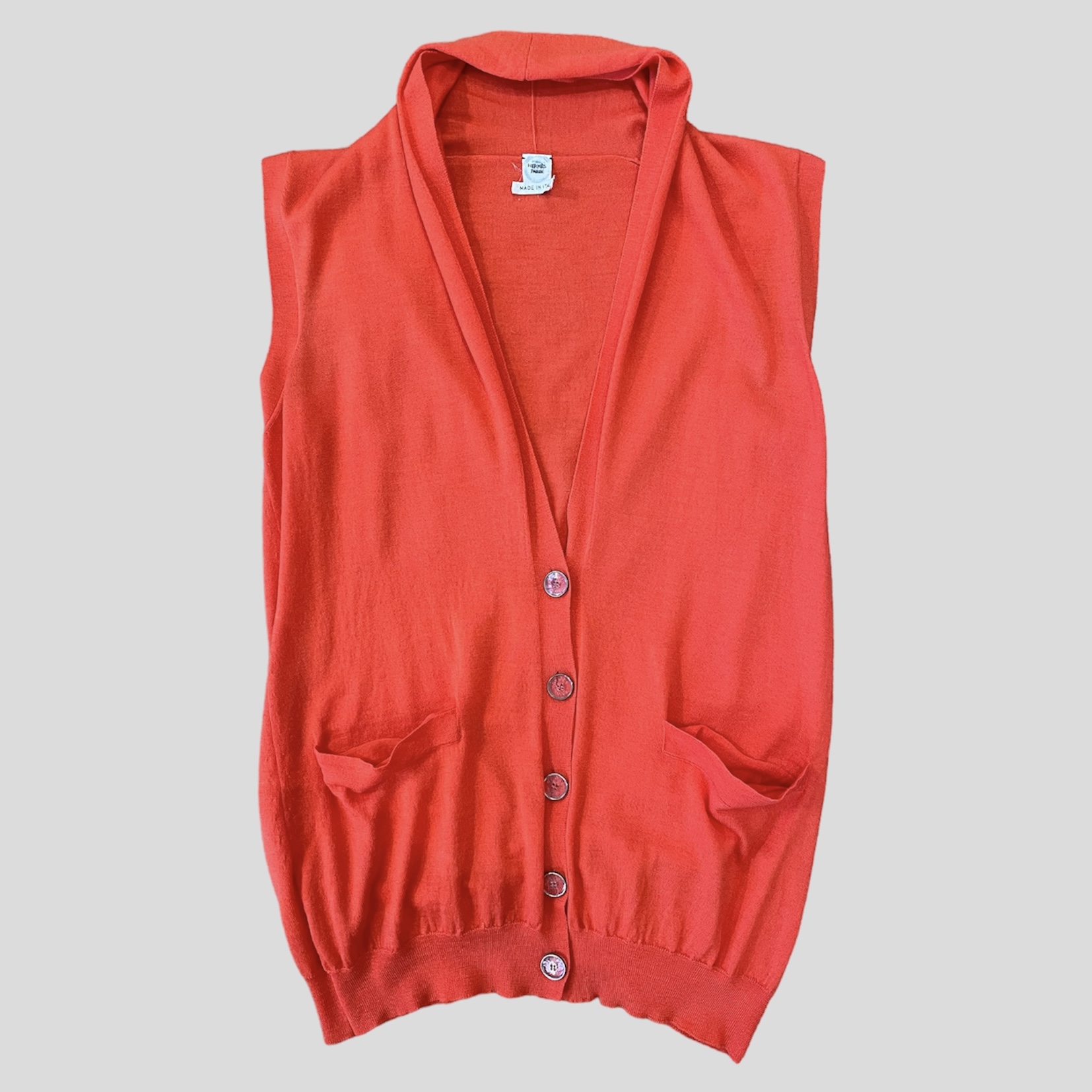 Hermès orange wool cardigan sleeveless designed by Christophe Lemaire. It has two front pockets, a high collar and a transparent button closure with logo.