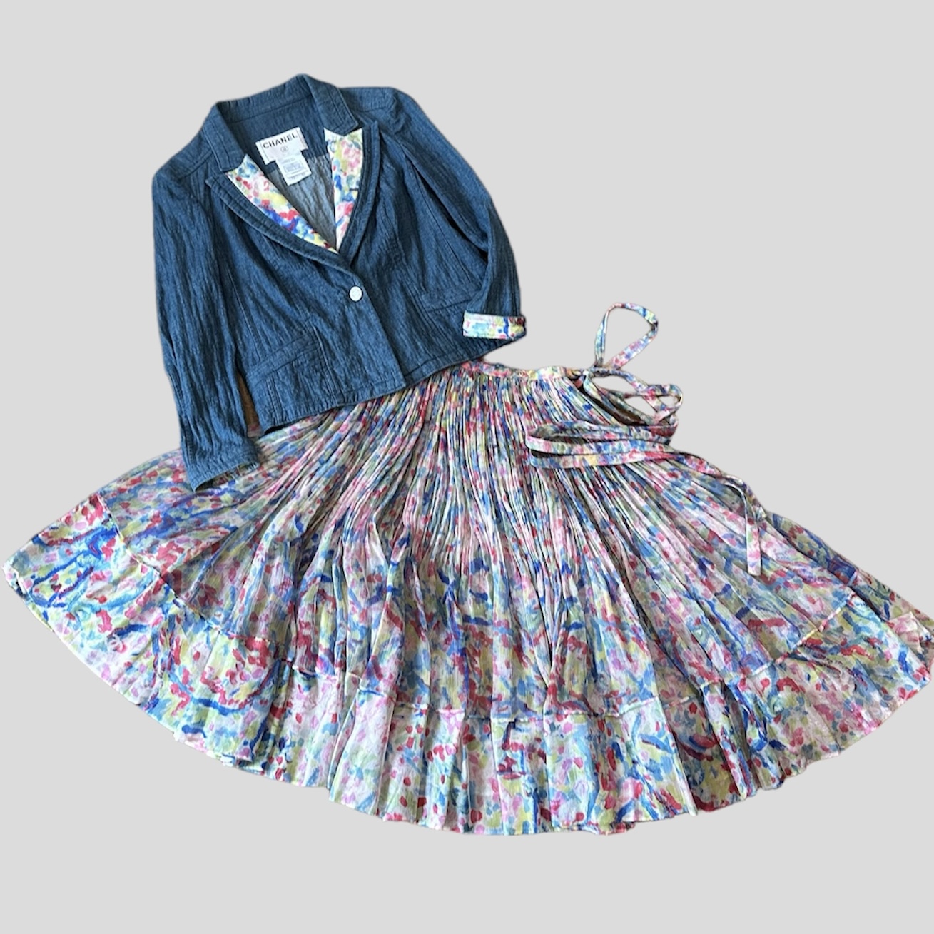 Chanel Denim jacket set with silk graffiti on the colar and two small pockets,