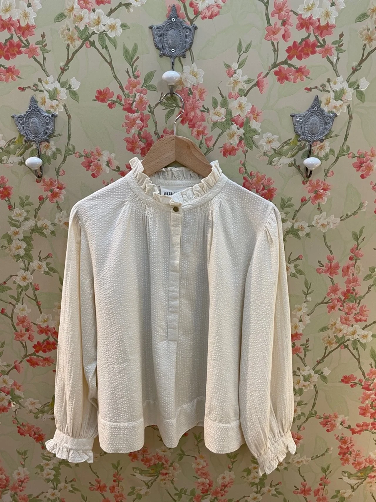 Blouse en coton coupe ample, manches longues bouffantes et poignets resserrés, emmanchure large, encolure boutonnée avec col à petits volants.