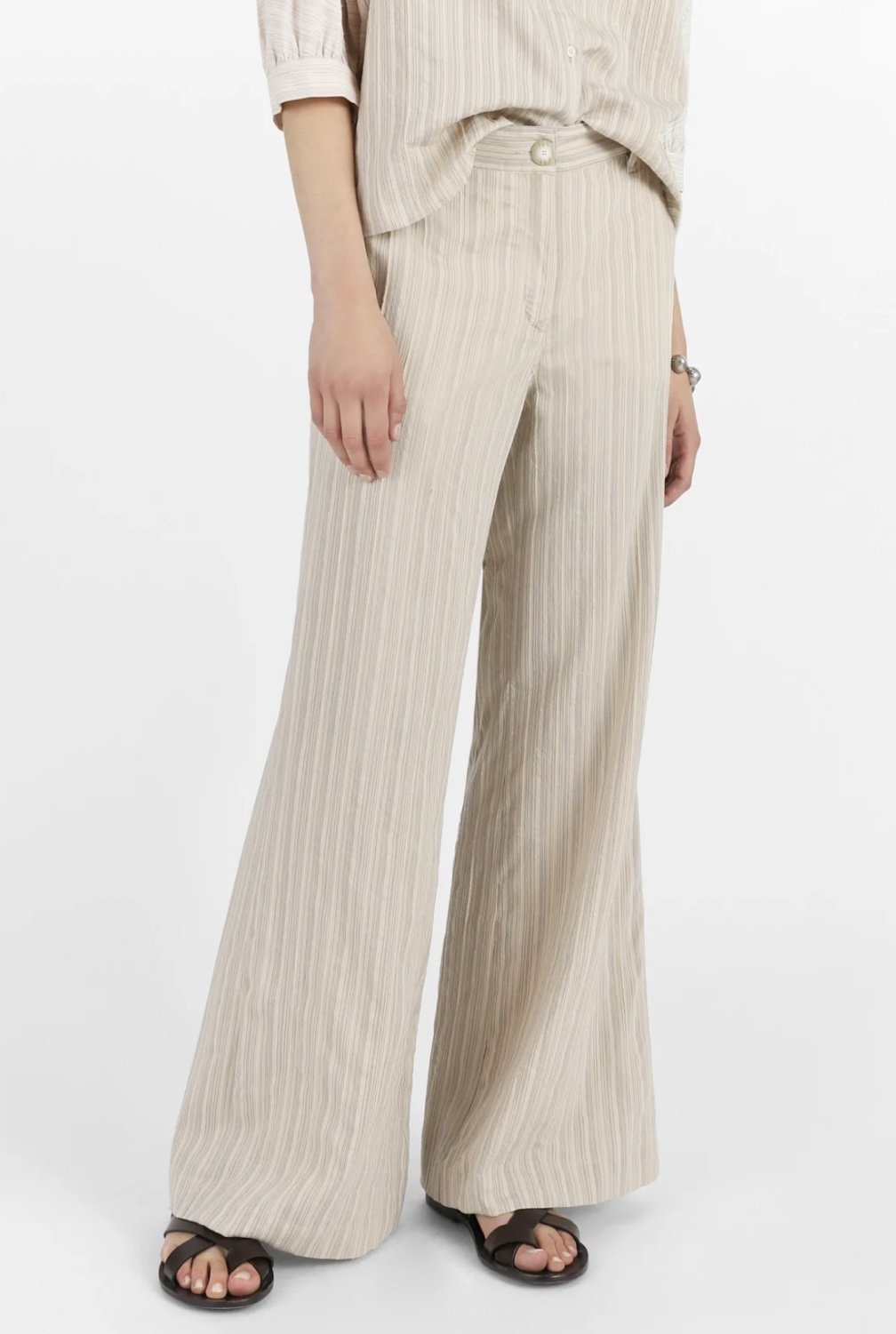 Pantalon taille haute, coupe flare, à fines rayures, poches latérales, doux et fluide. Sur la photo le modèle porte le pantalon avec la blouse Pomona Nectarine.
