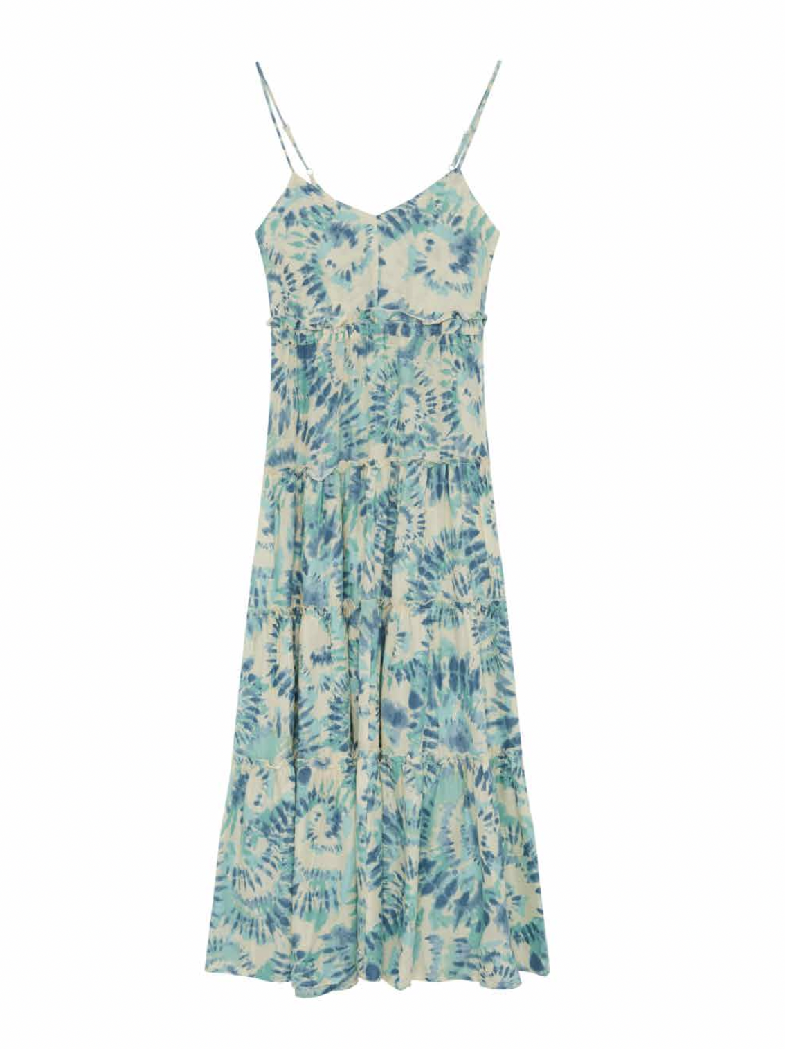 Robe en coton coupe ample, boutonnée sur le devant avec un volant, manches longues, poignets resserrés, emmanchure large. Peut se porter ample ou ceinturée. Également disponible en bleu et rose.