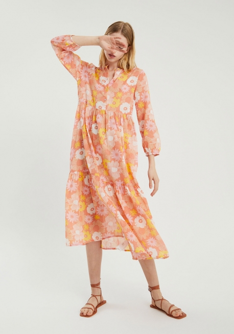 Blouse coupe ample à motif floral, boutonnée sur le devant par 7 petits boutons. Encolure arrondie, manches longues avec poignets boutonnés. Fraîche et légère.
