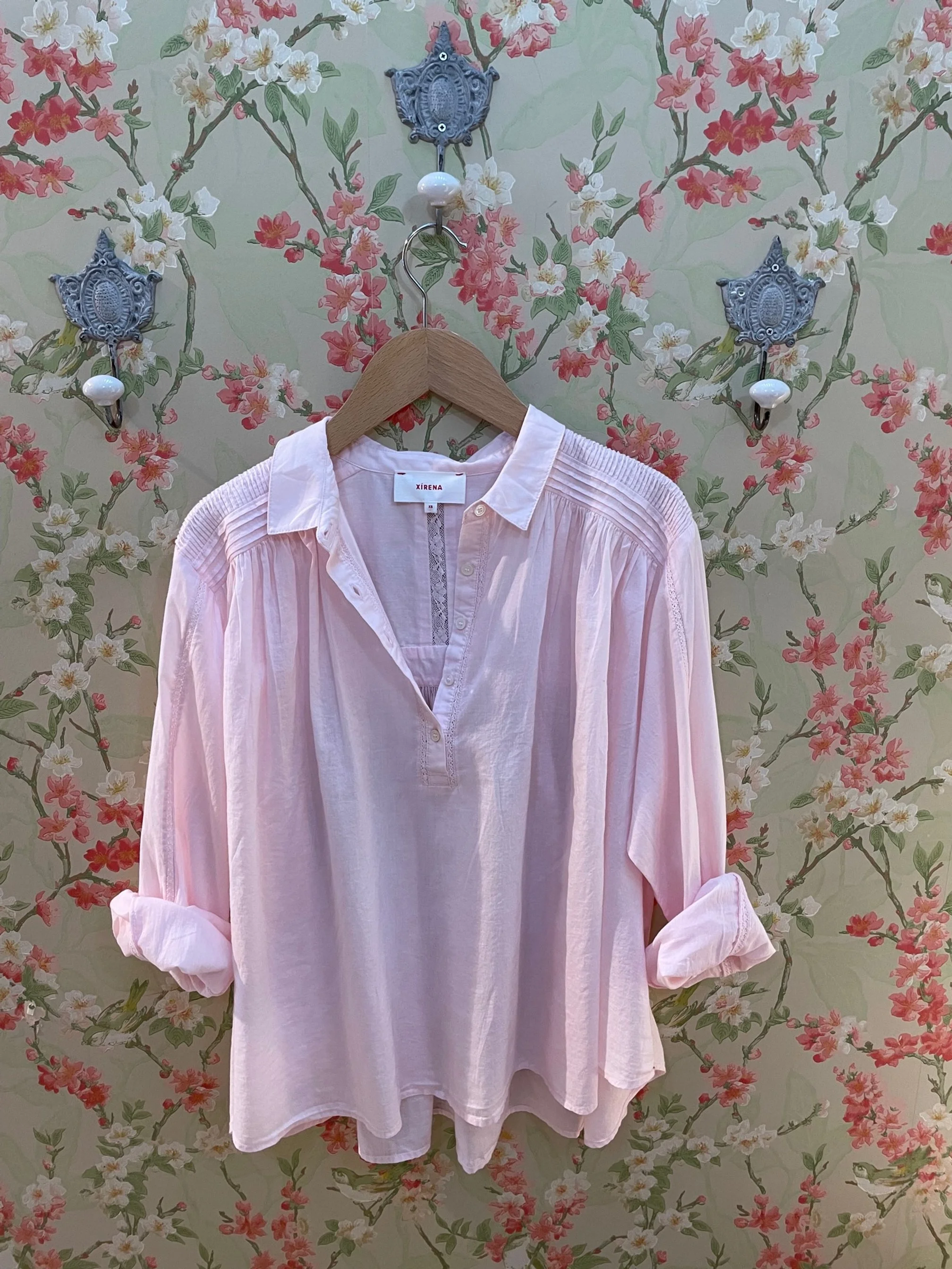 Blouse coupe ample, manches longues et bouffantes, poignets resserrés. Encolure arrondie et boutonnée sur toute la hauteur devant. Plastron plissé devant et dos. Également disponible dans d’autres couleurs.
