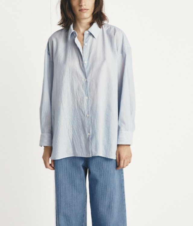 Grande chemise en coton à fines rayures, coupe ample, manches longues et poignets resserrés, emmanchure large, légèrement plus longue dans le dos. Le modèle taille grand et se porte grand.