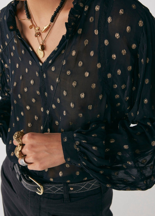La blouse Vega en Etoile Midnight.Coupé dans un tissu viscose lurex ultra doux, ce chemisier à col en V simple mais élégant présente un délicat combo de ficelle et de pompon, un col à volants, des manches légèrement surdimensionnées et des poignets boutonnés.