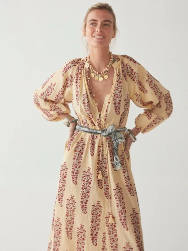 Une magnifique robe longue mi-boutonnée réalisée dans un imprimé floral inversé d'inspiration vintage sur un voile de coton super doux.