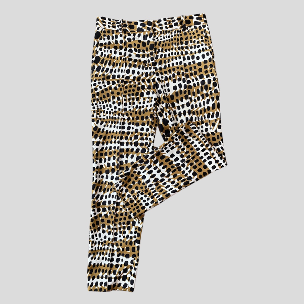 Straight-leg brown and white Céline pants with black pattern. Two pockets at front and back. Front zipper closure.