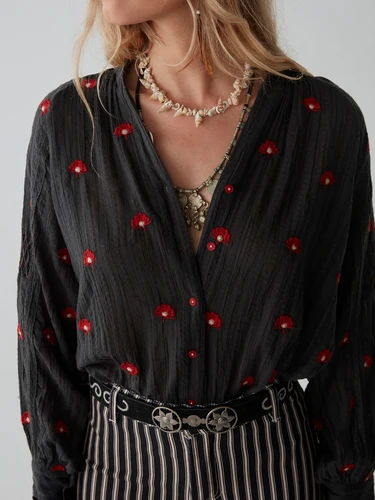 Confectionné dans le coton le plus fin, la broderie florale rouge complexe du chemisier est méticuleusement placée pour créer un contraste saisissant avec le tissu anthracite profond. Les détails froncés sur les épaules et le long des manches ajoutent une couche de profondeur et de texture, soulignant le savoir-faire qui se cache derrière chaque centimètre. Les fronces douces aux poignets et les plis précis le long de l'encolure offrent une finition sur mesure, assurant une silhouette flatteuse sans compromettre le confort.