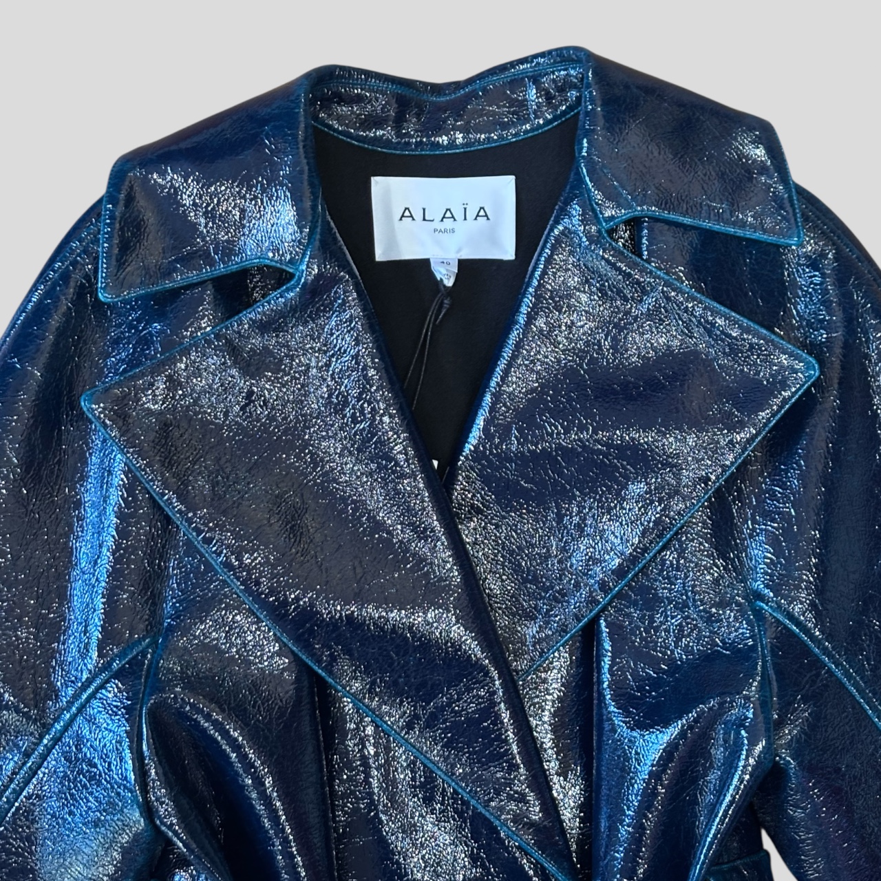 Alaïa Trench Coat Oversize in blue. coated wool blend, double-breasted with six horn buttons. The waist is cinched with a belt. Features side pockets.