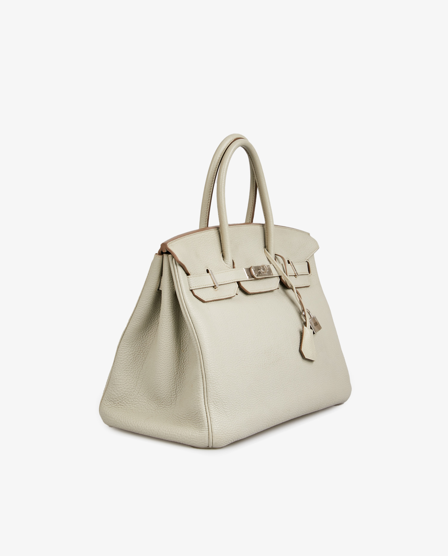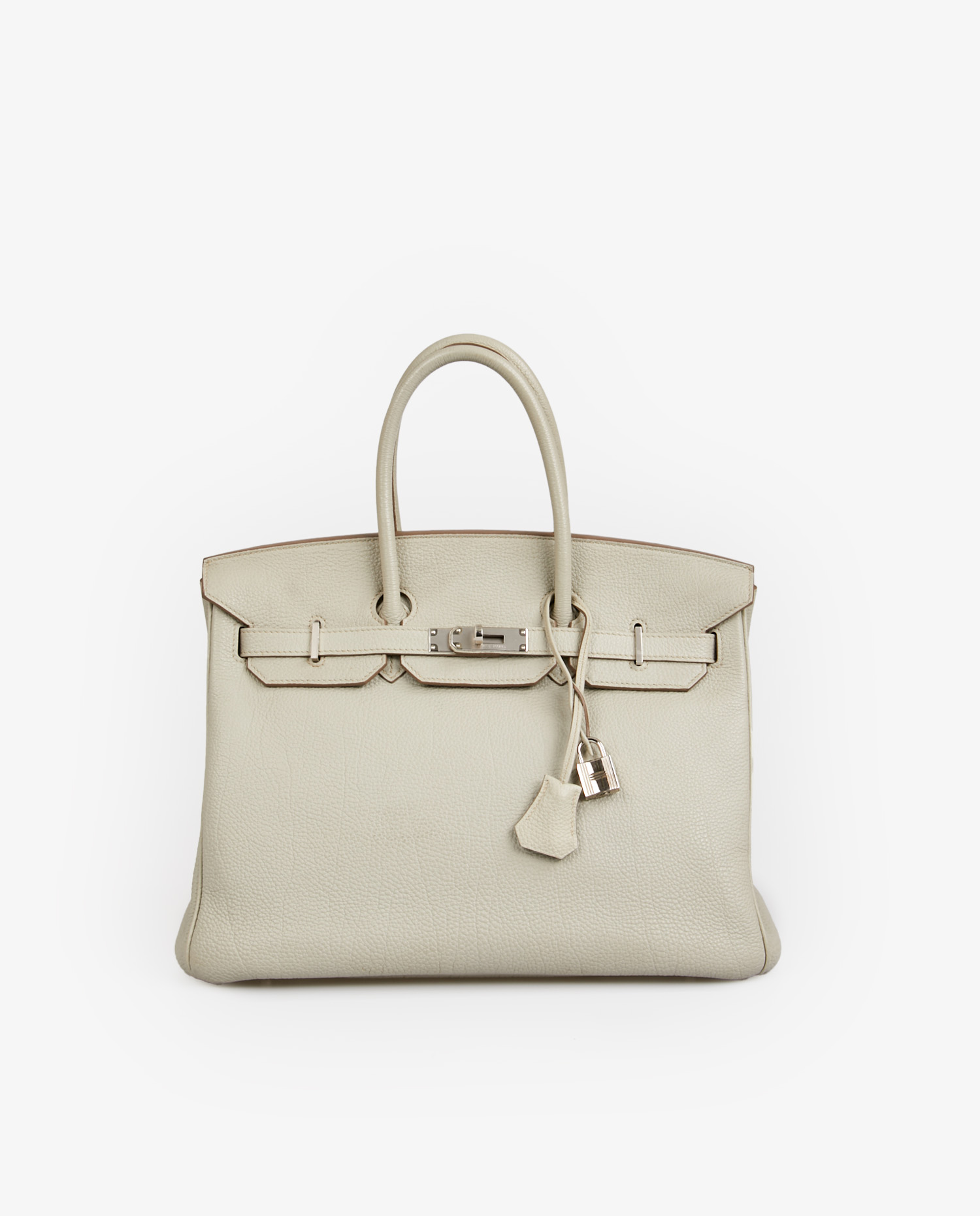 Né en 1984 de la rencontre entre Jane Birkin et Jean-Louis Dumas, le Birkin est rapidement devenu une icône de la maroquinerie Hermès. Sa conception pensée pour être à la fois pratique, spacieux et sophistiqué en fait un modèle convoité dès ses premières années. Le format 35 cm est le plus polyvalent de la ligne, adapté aussi bien à un usage quotidien qu’à des occasions plus formelles. Le cuir Togo, introduit dans les années 90, est rapidement devenu un standard de la maison pour sa légèreté, sa capacité à conserver sa forme et sa texture naturellement élégante. Le coloris Gris Neve, confidentiel et rarement proposé, ajoute à ce modèle une valeur singulière recherchée par les collectionneurs.