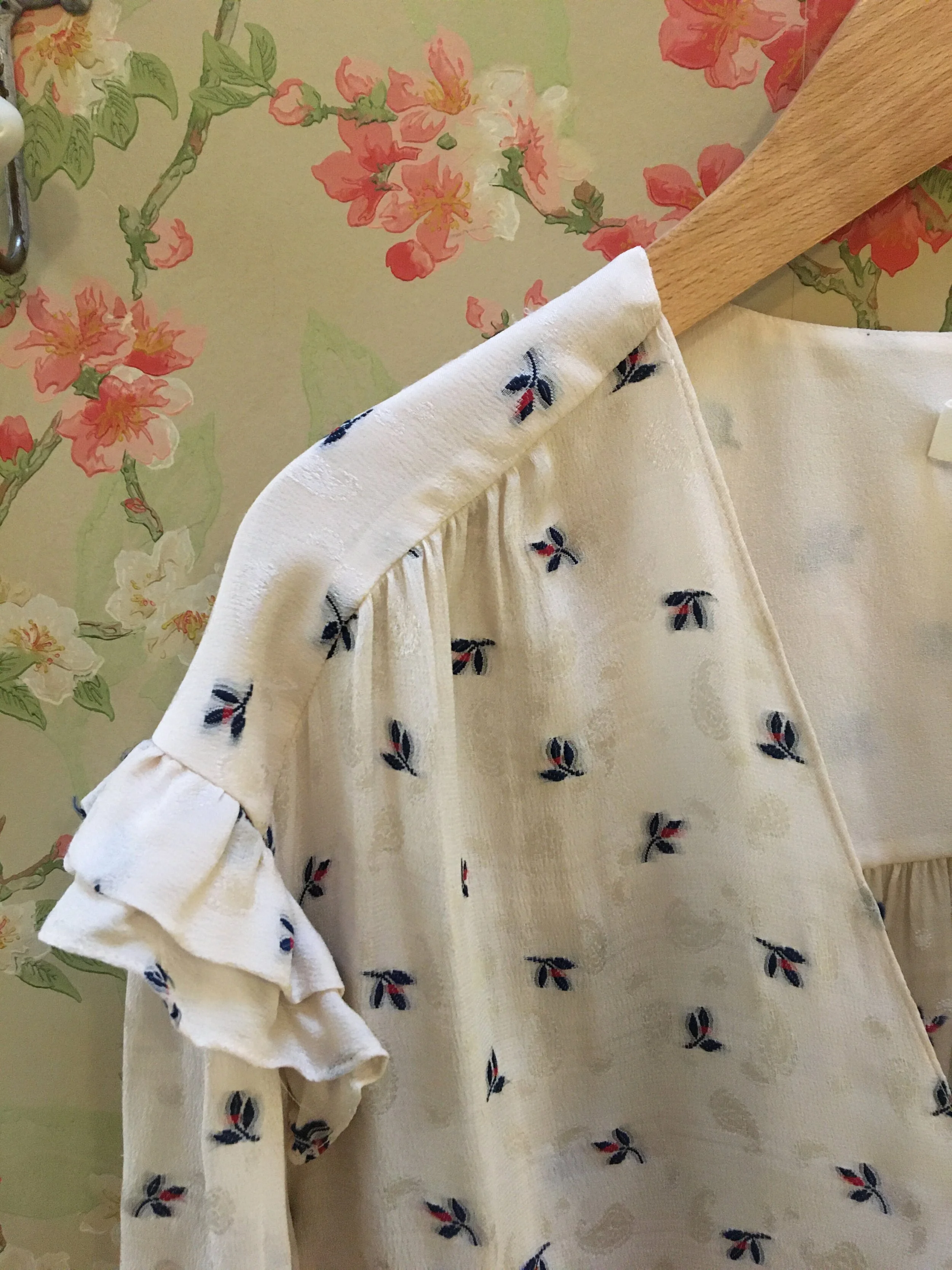 Blouse en soie ample à motif floral, décolleté en cache coeur sur le devant, manches longues avec poignets boutonnés et détail volant aux épaules. Légèrement plissé sur la ligne d’épaule. Découpe dans le dos avec plissé.