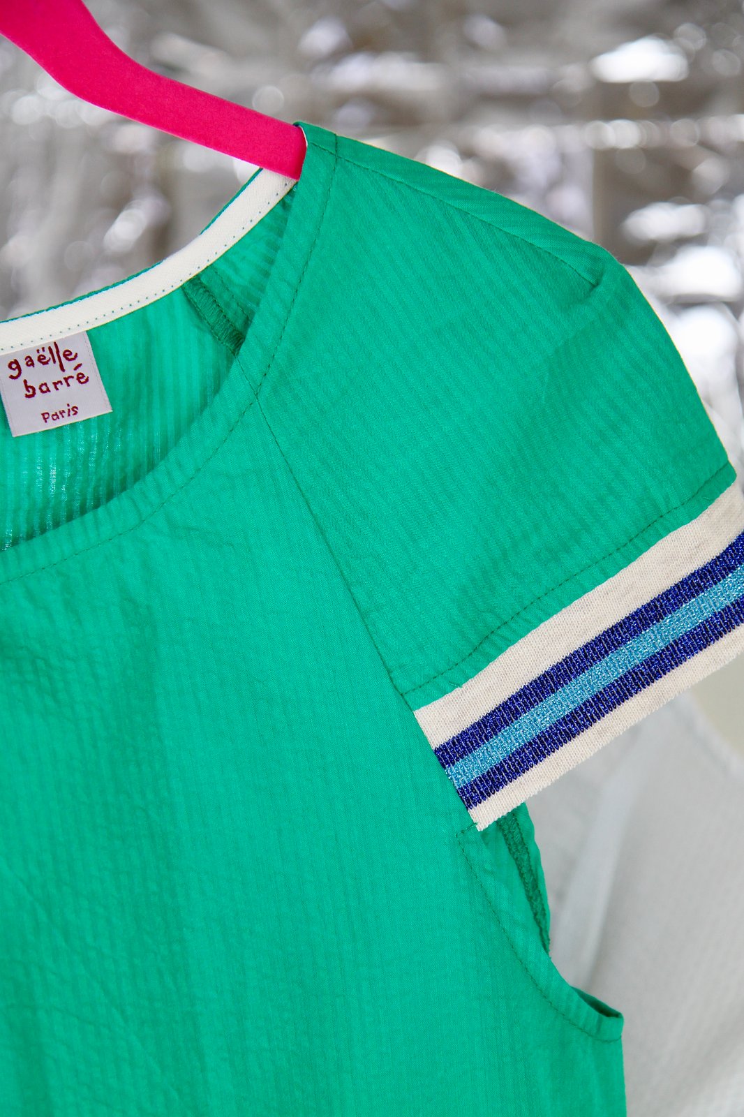 Blouse en coton type seersucker uni, manchettes bordées de bord-côte. Coloris: vert, bleu et blanc 125€-50%: 63€