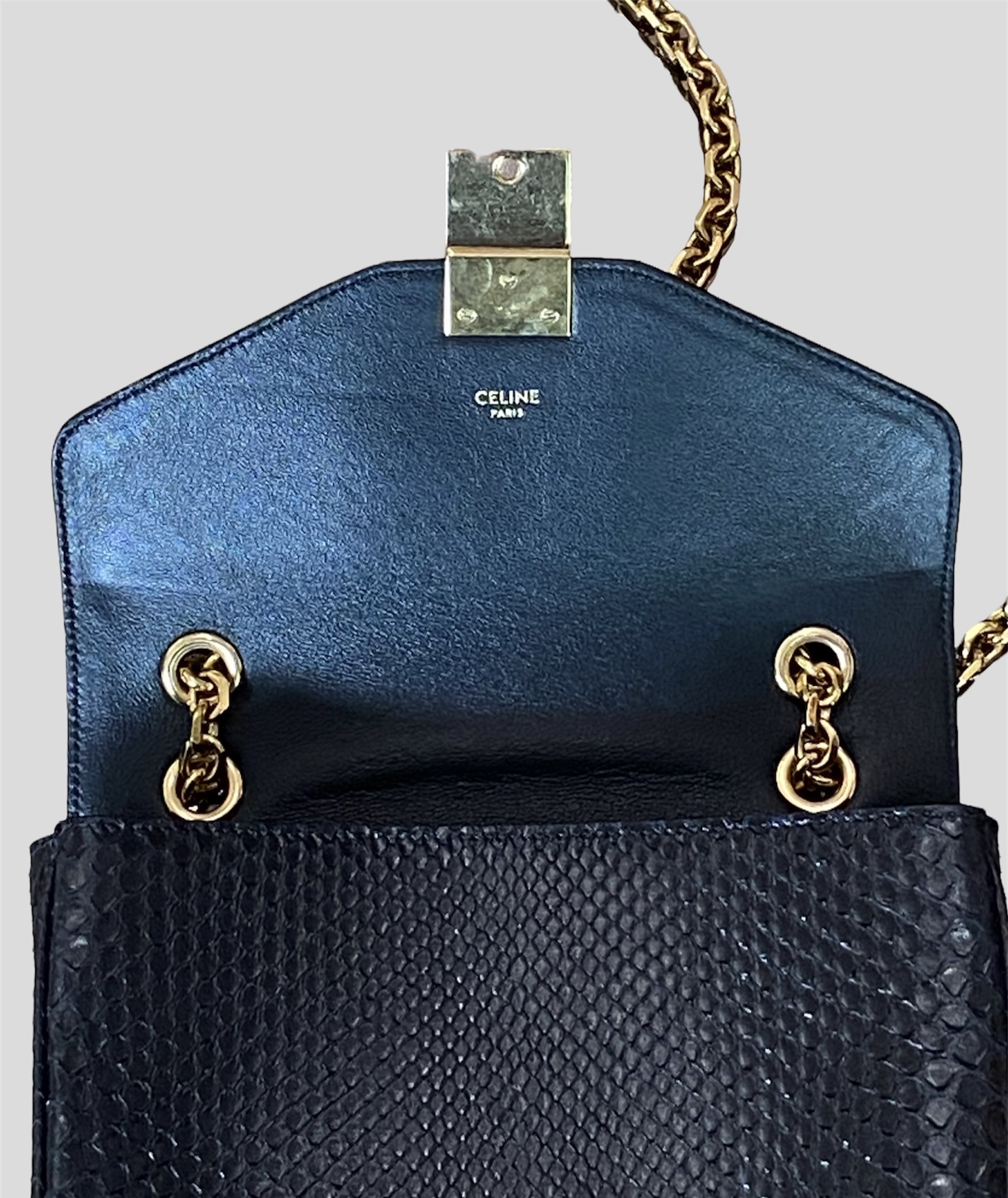 Céline “C” Bag in black python with his gold chain and his iconic logo as the central button