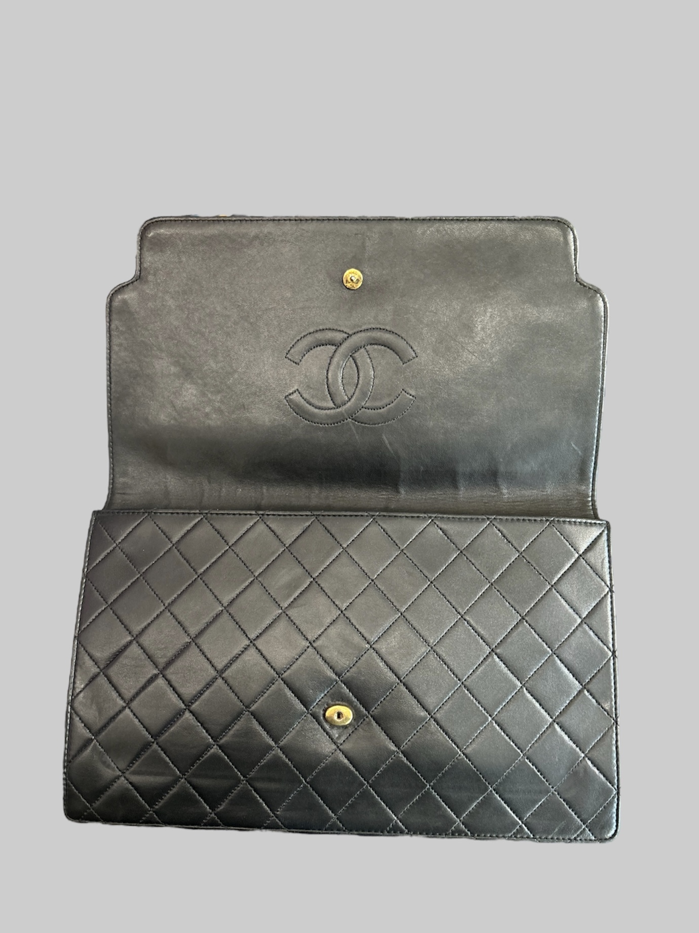 Chanel black leather clutch bag, dating from between 1889 and 1991. The lining is in red leather and the serial number is on the inside.