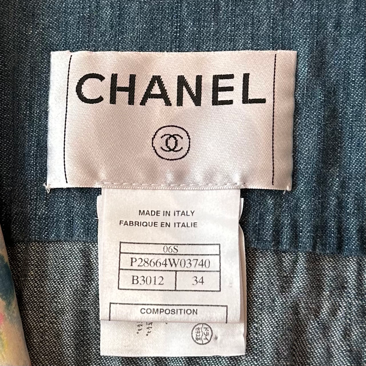 Chanel Denim jacket set with silk graffiti on the colar and two small pockets,