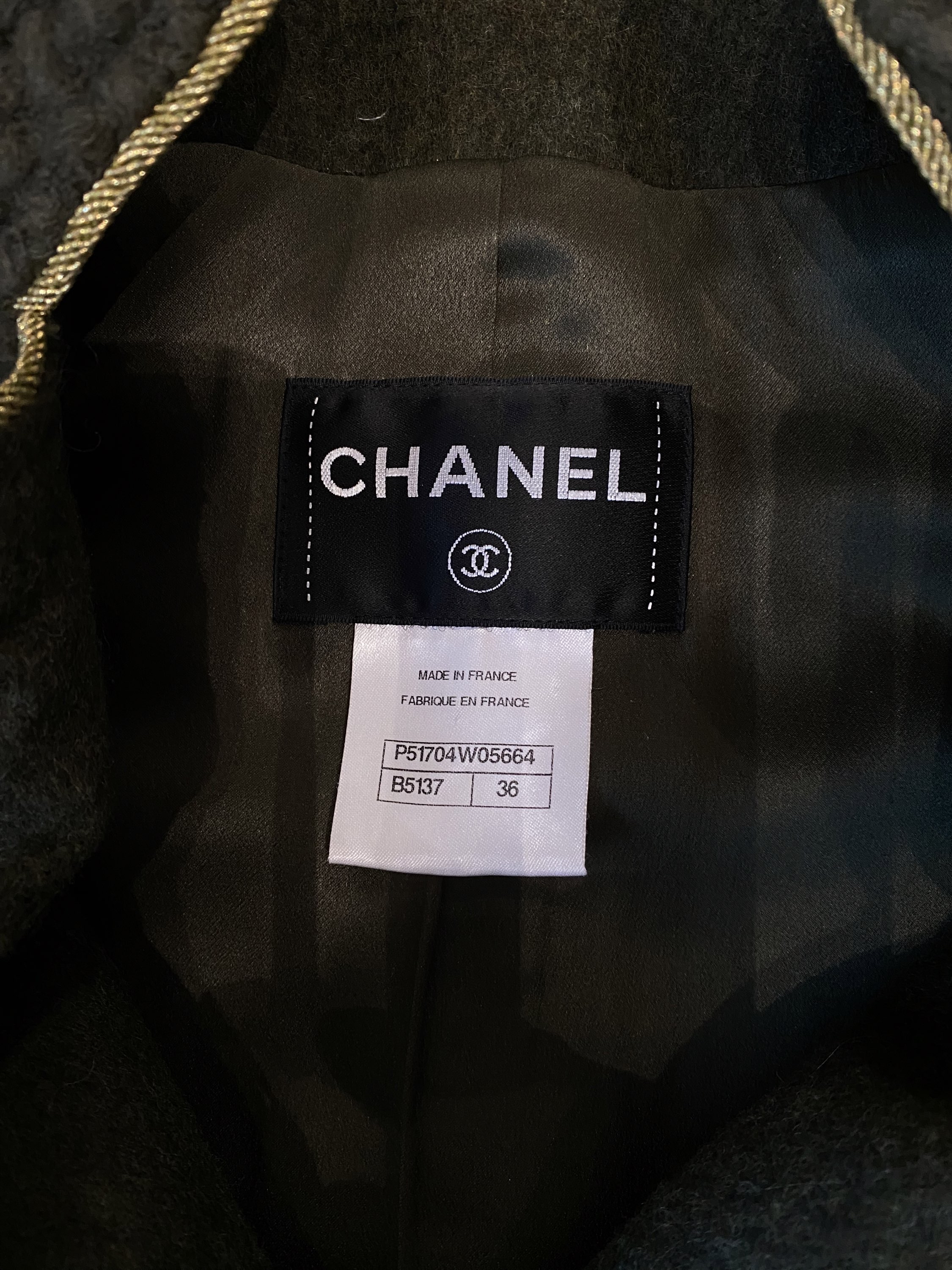 Chanel Salzburg Jacket khaki in wool with jewelled Gripoix “CC” buttons. There is a full-lenght gold woven trim and silk lining. From Paris-Salzburg 2014/15 Métiers d’art Show.
