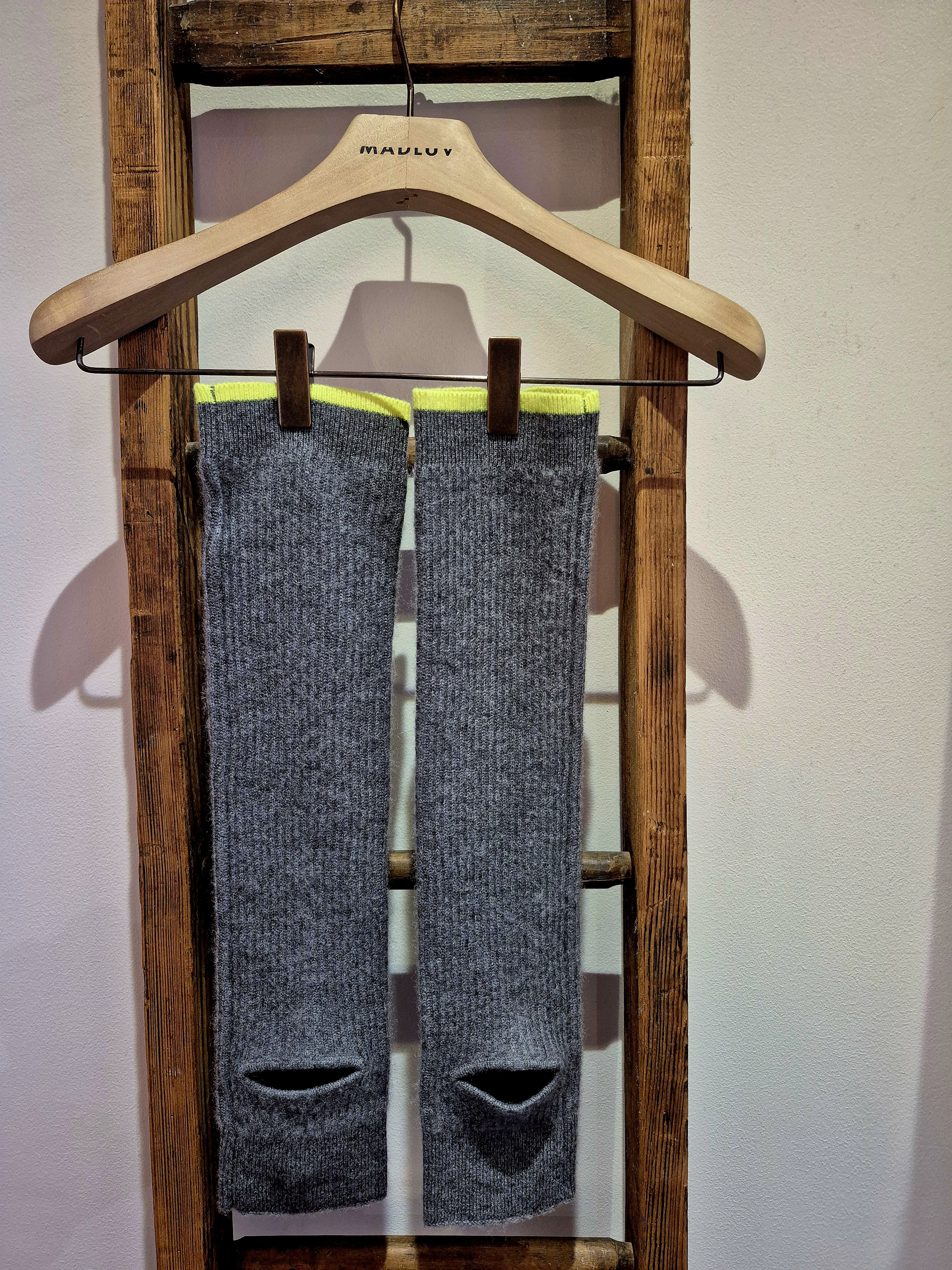 SAMY : Chaussettes100% cachemire aux extrémités ouvertes avec un tricotage à côtes pour une tenue parfaite. – Bord coloré qui ajoute une touche d’audace.100% cachemire- Taille Unique – Coloris : Gris + bord coloré Jaune. Existe aussi en Bleu, Camel, Vert.