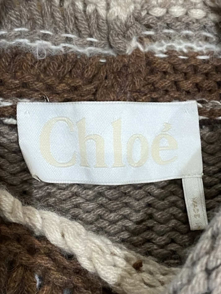 Chloé Knitted Poncho in beige and brown with stripes and fringe details.