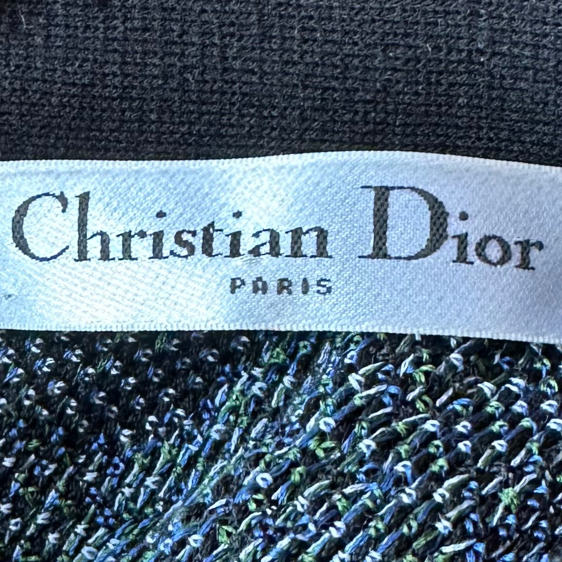 Christian Dior Collection short flared dress. Material looks like straw. The composition label is missing. It has woven designs in blue and green. It fastens with a zip at the back.