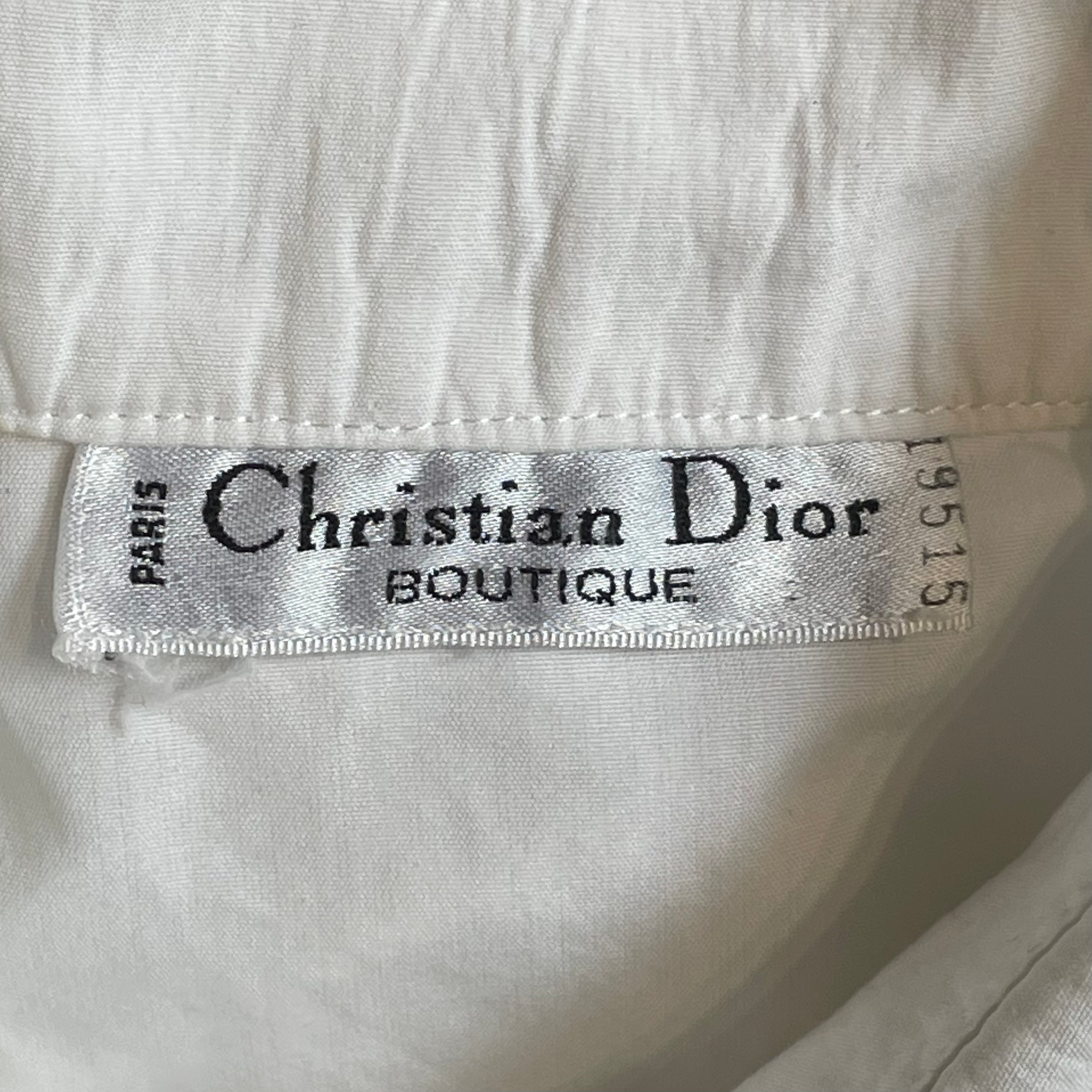 Christian Dior “Haute Couture” Bodysuit with blue and white vichy details on the cuffs. Two buttons of different sizes are on the cuffs. Button closure on the bust and zip on the hip.