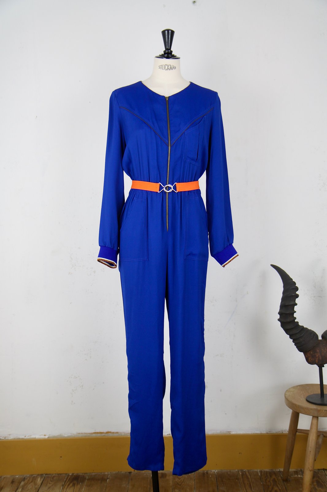 Combinaison fluide en crêpe viscose italien. Coloris bleu très intense.. Poignets bords cotes. Vendue sans ceinture. Prendre votre taille habituelle. 235€ -50%= 117,50€
