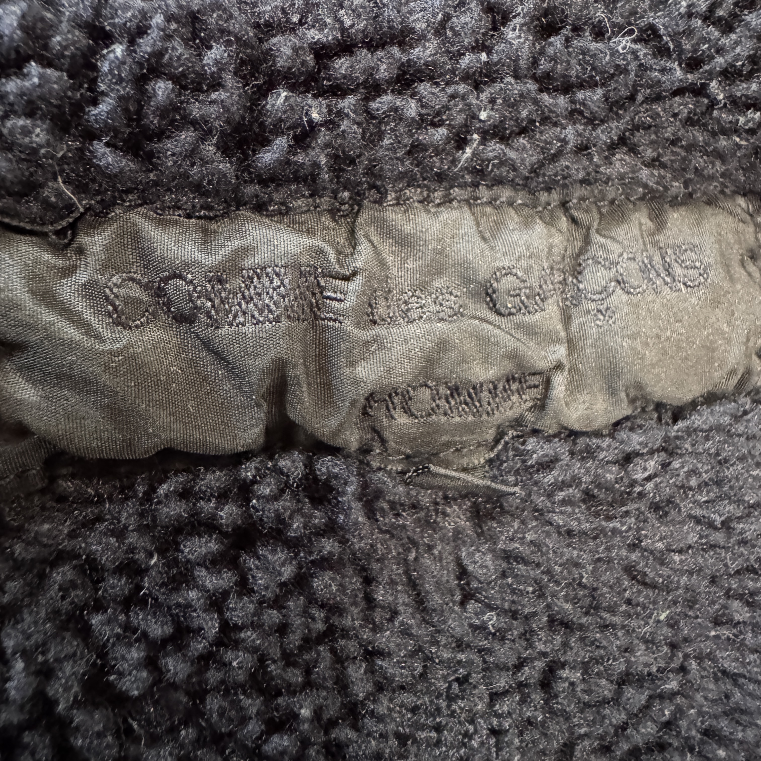 Comme Des Garçons Wool Jacket in navy blue featuring a cotton exterior and a soft wool lining for extra warmth and comfort. there is four front pockets and buttoned sleeve ends that can be opened for added versatility. From 2005.