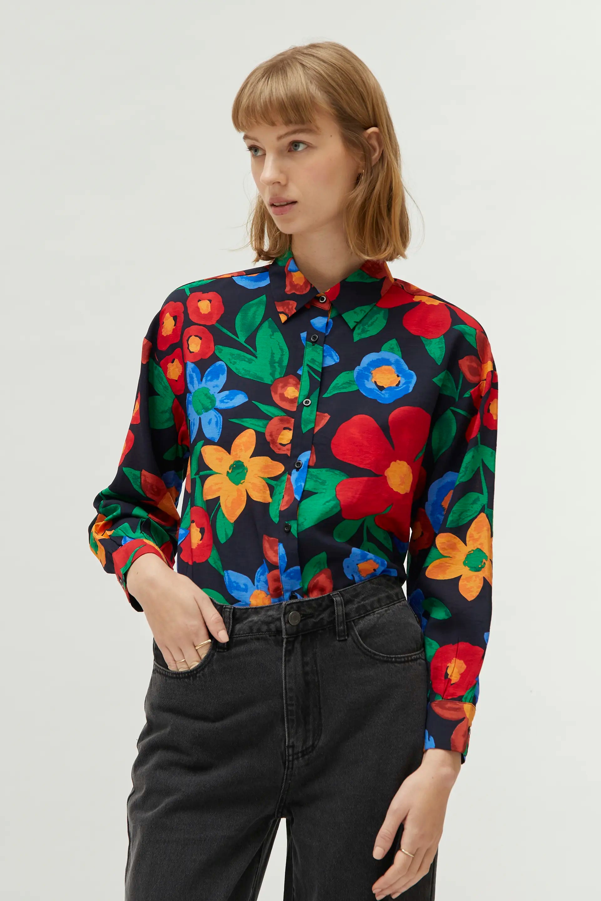 Chemise en crêpe de viscose à imprimé fleurs multicolores. Avec col à revers et manches longues. Fermeture boutonnée sur le devant.