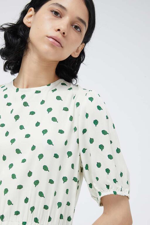 Robe midi à imprimé artichaut. Avec une encolure ronde et des manches courtes bouffantes terminées par un élastique. Modèle avec coupe à la taille. Fermeture au dos avec fente et bouton. Doublure intérieure. Le mannequin mesure 175 cm et porte une taille S