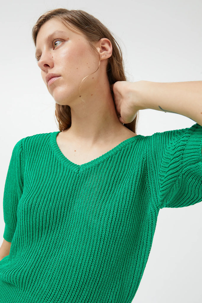 Pull tricoté vert. Avec un col en V et des manches courtes avec du volume. Détail des finitions nervurées. Le mannequin mesure 177 cm et porte une taille S
