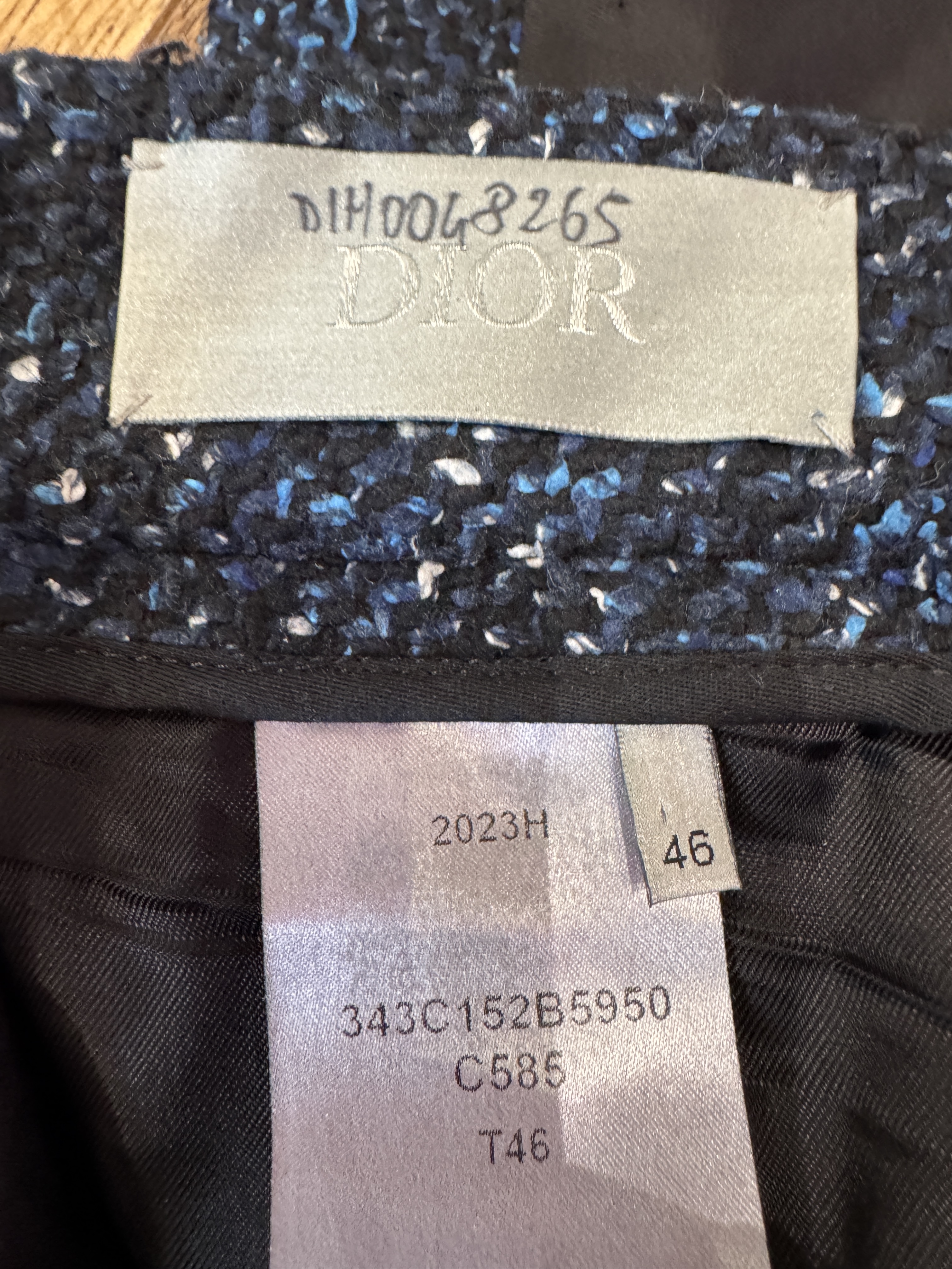 Dior Layered Skirt Pants in tweed with several shades of blue. There are two side pockets at the front and one patch pocket at the back. It is a short that looks like a skirt in layering. This piece is from Dior Homme 2023.
