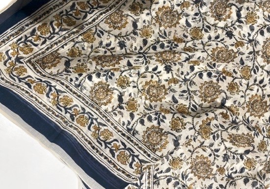 Foulard Asha – bleu marineGrand carré en coton, avec un imprimé indien fleuri dans les tons de marine, jaune et beige.Dimensions : 100 x 100 cmComposition : 100% coton