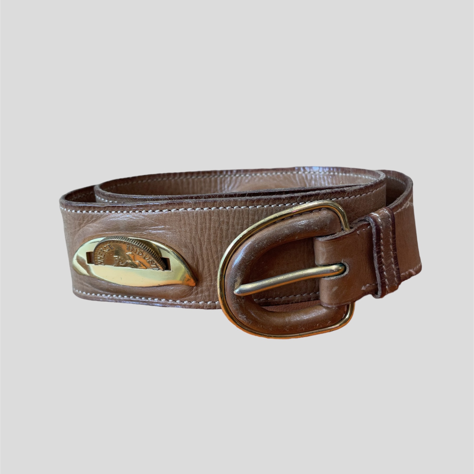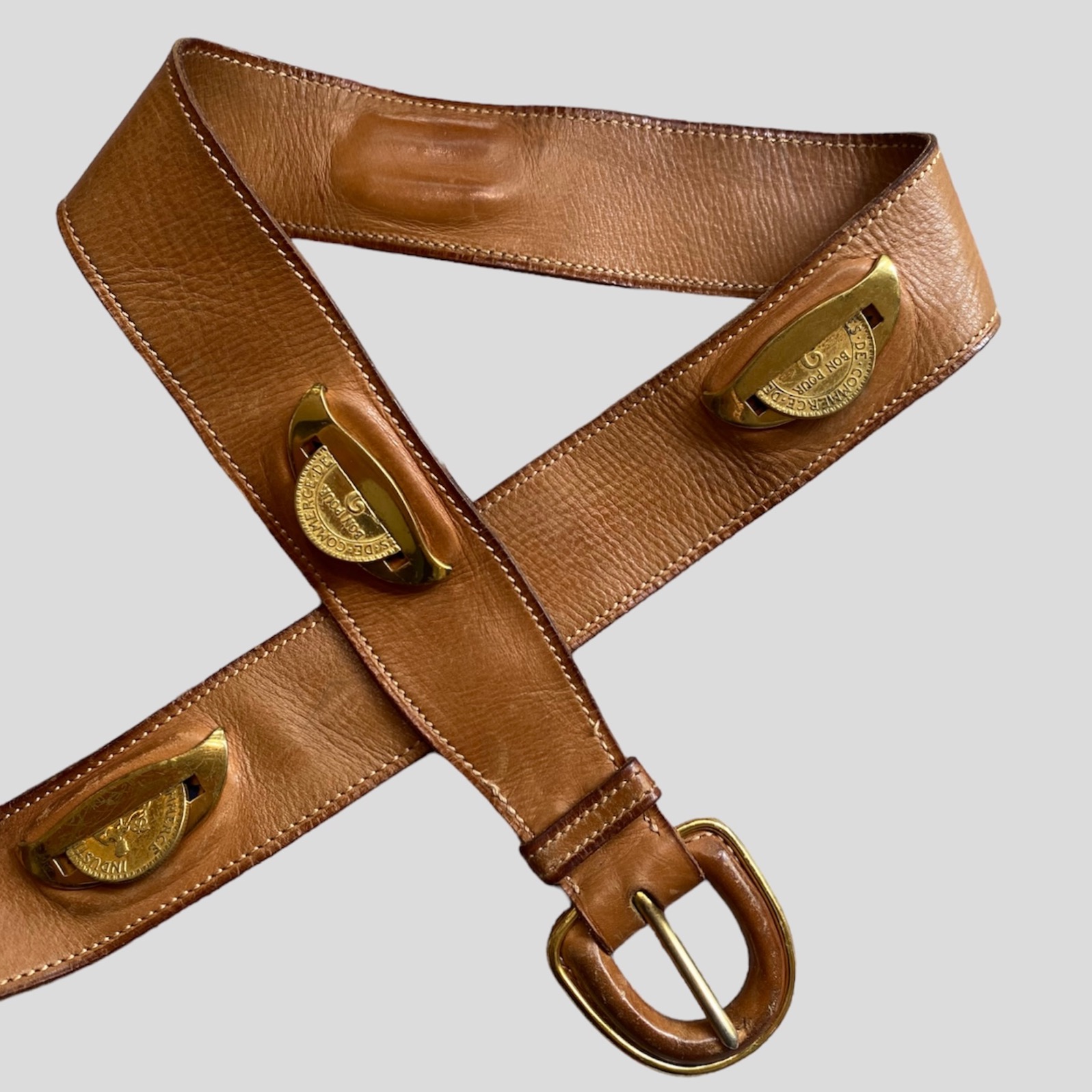 Hermès collector belt in soft leather with golden coins details where it is written in French “Liberté Égalité Fraternité”. Those details of coins are found throughout the belt.