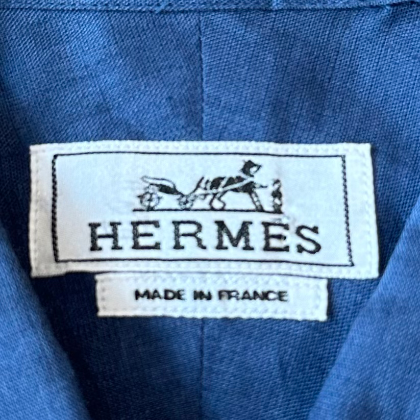 Hermès Men blue shirt in linen with zipper closure from the 2000s. There are buttons on the front and on the cuffs. There is a side edge at the bottom of the jacket and 2 zip pockets.