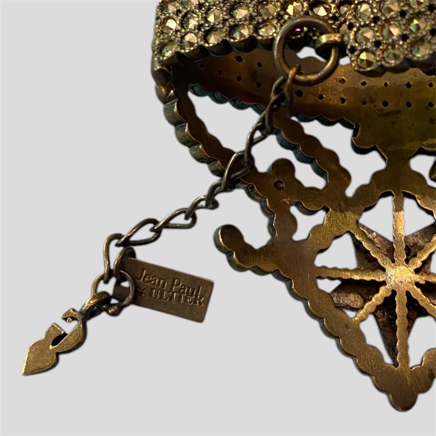 Jean Paul Gaultier Strass bracelet in antique gold metal, decorated with Swarovski rhinesthones. Star and arabesque details