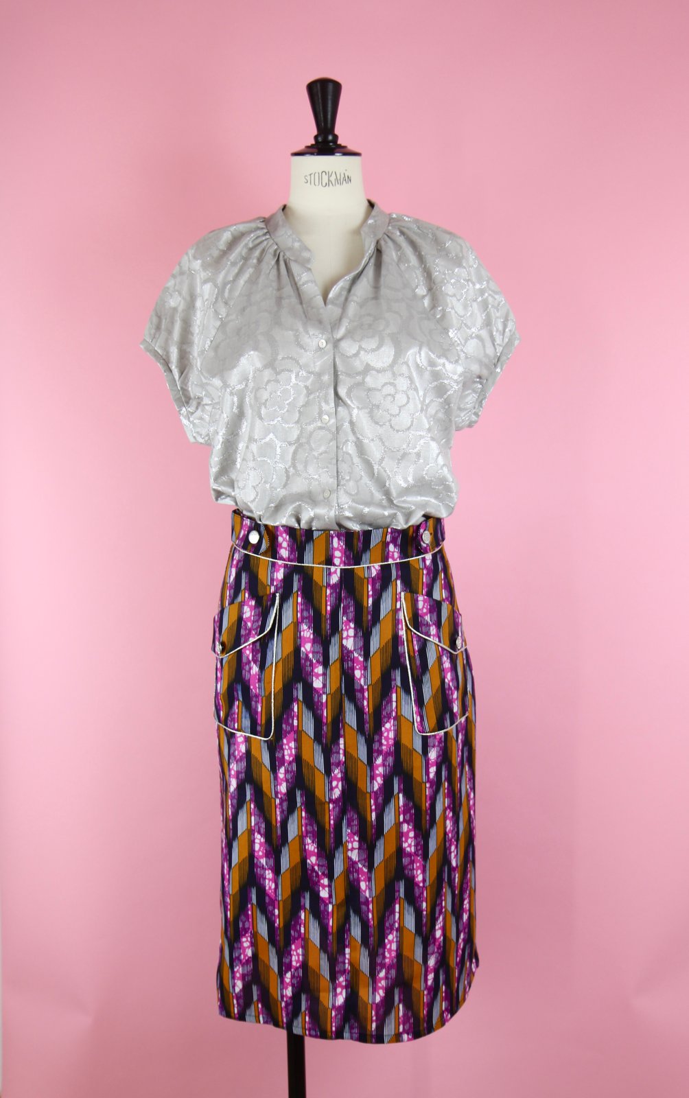 Jupe en coton imprimé. Finitions de passepoil argent. Jupe doublée. C’est un modèle qui se porte plutôt taille haute, légèrement évasée. Prix: 188€ -20%= 149€